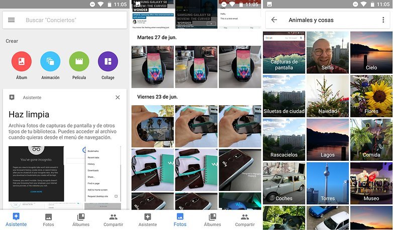 No tienes que pasarte horas clasificando tus fotos ya que Fotos las ordena por ti. En la pestaña de fotos las tenemos ordenadas cronológicamente y en la de álbumes podemos encontrar grupos clasificados por lugar o temática. También podemos crear álbumes, animaciones, vídeos o collage en minutos con su asistente.