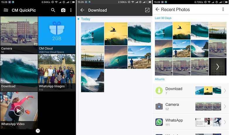 QuickPic es una galería muy sencilla que contiene todas las carpetas del dispositivo. Dentro de cada una las fotos se ordenan cronológicamente. En el menú lateral podemos ordenar todas las fotos del dispositivo pulsando sobre Moments. También podemos disfrutar de un backup en la nube de Cheetah Mobile o conectar con nuestro servicio en la nube favorito.